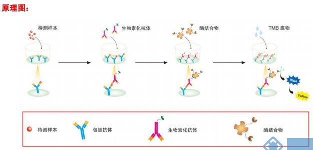 霉亲和素会发生高强度的非共价结合;洗板后加入显色剂底物 TMB,若反应孔中样品存在不同浓度的人