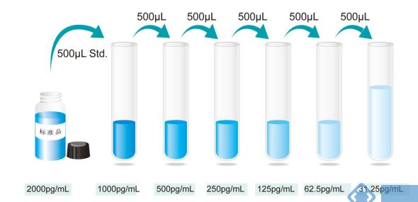 进行2倍稀释:2000、1000、500、250、125、62.5、31.25、0 pg/ml进行稀释。2000pg/ml为标准曲线最