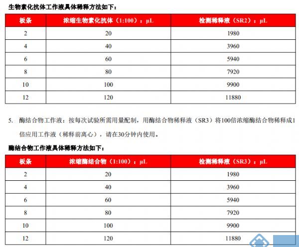 4. 生物素化抗体工作液:预先计算好试验所需用量,用检测稀释液(SR2)将100倍抗体浓缩液稀释成1倍 应用工作液(稀释前充分混匀),请在30分钟内加入到反应孔中。